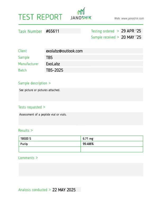 • Purity and Quality: Our TB500 5mg peptide is manufactured with stringent quality control to ensure research-grade purity. Each batch undergoes rigorous testing to meet the highest standards.